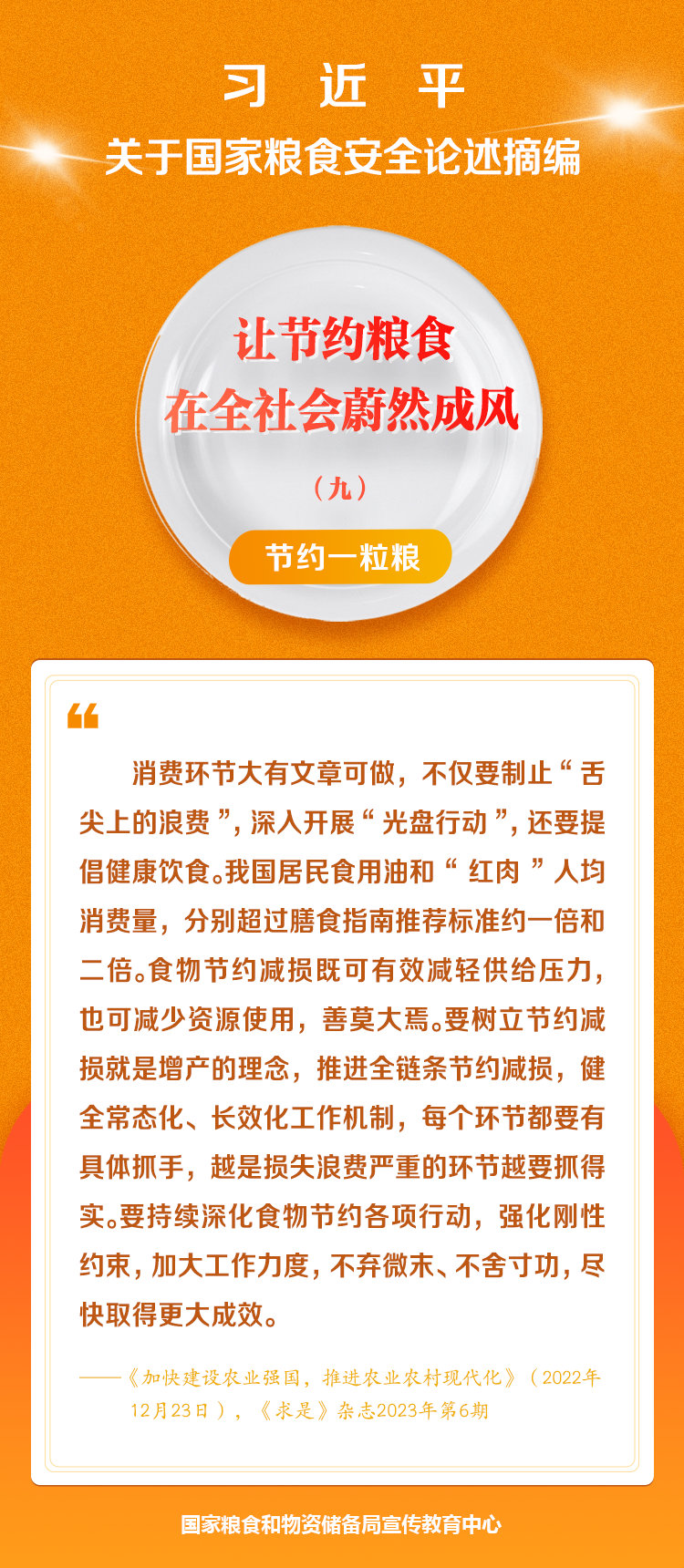 我们摘选了《习近平关于国家粮食安全论述摘编》第七个专题“让节约粮食在全社会蔚然成风”的重要论述,制作成9张海报,和大家一起分享。